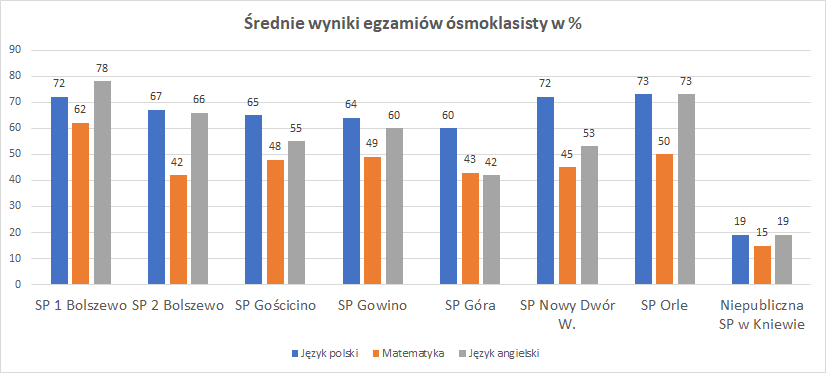 Zaznaczyć należy, że osiągnięte rezultaty egzaminów uplasowały szkołę podstawową nr 1 w Bolszewie i SP w Orlu w czołówce w powiecie. Placówki te osiągnęły odpowiednio 2 i 3 miejsce.